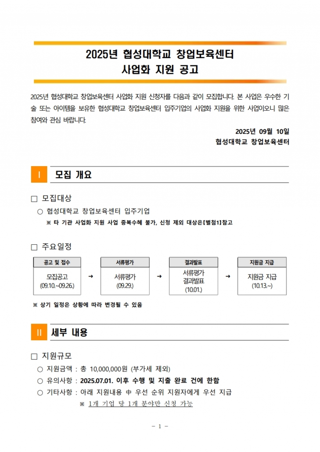 (마감)2025년 협성대학교 창업보육센터 사업화 지원 신청(~9/26(금) 오전 10시까지)