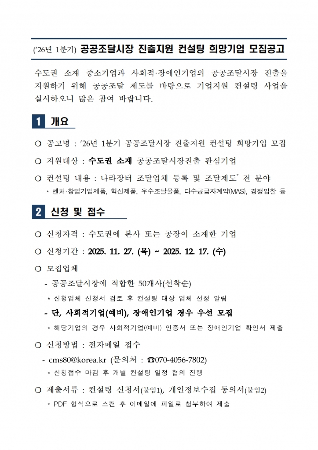 공공조달시장 진출지원 컨설팅 희망기업 모집공고(~12.17.(수))