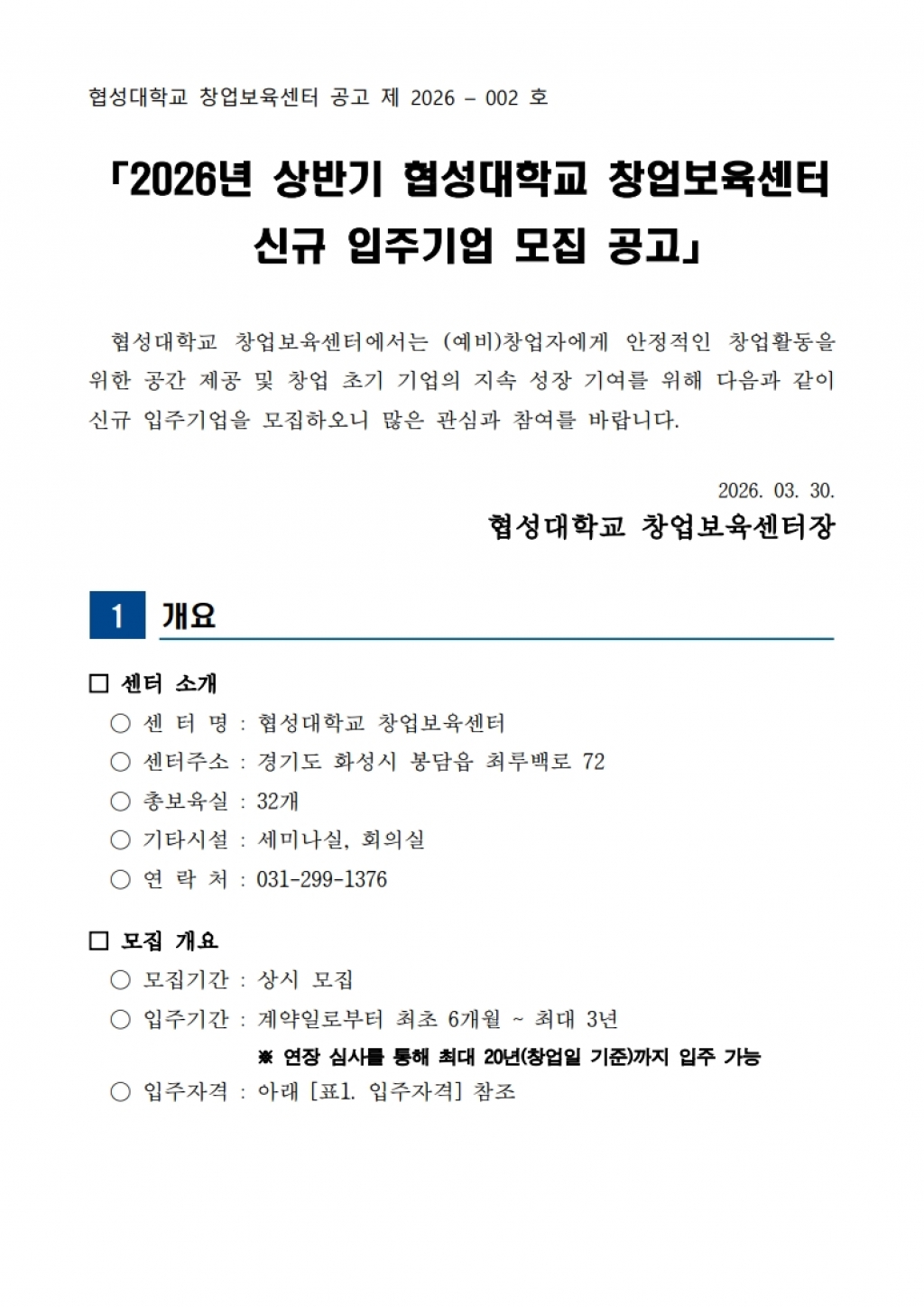 2026년 협성대학교 창업보육센터 상반기 신규 입주기업 모집공고